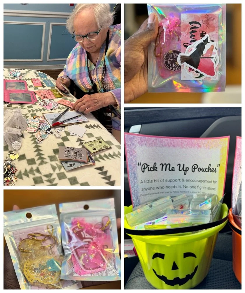 I started putting together “Pick Me Up” pouches that contain a card sharing my story, inspirational wallet cards, candy, water bottle stickers, bracelets, keychains, surprise trinkets, and holiday or event themed items. From fellow patients undergoing treatments and surgeries, to random people just needing an extra little “Sprinkles of Faith”, I knew I could hopefully bring some smiles to people who needed it. I quickly realized from the positive feedback in my community that ANYONE who received a pouch, said it brought a smile to their face! Since then my family has worked hard to expand- and inspire and lift up as many people as we can! To date we have “sprinkled” over 1000 people at NCH’s infusion clinic, 2 Arlington Heights based mental health facilities, for special events, and out on random days where we leave them in spots to be discovered, and more! If you would like a basket or bucket of “Pick Me Up” pouches for your facility, patients, welcome desk, or event please send a request through the form below.